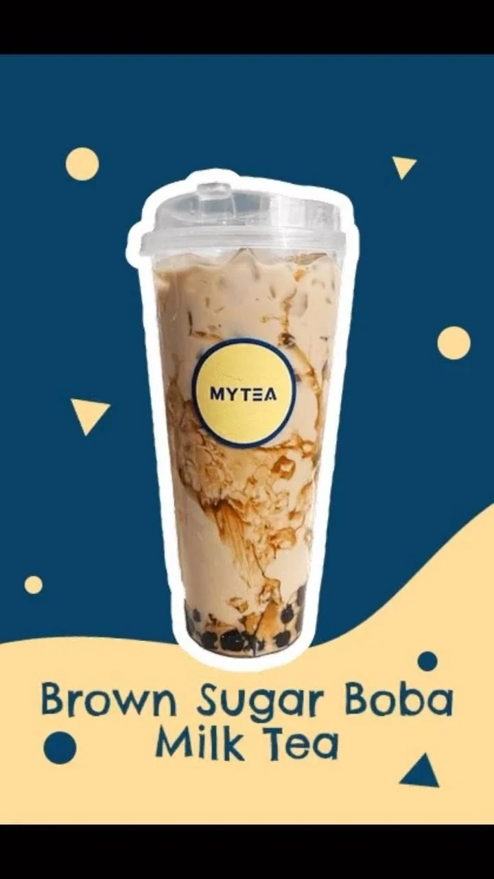 A large iced bubble tea with brown sugar syrup at the bottom and tapioca pearls. The cup has a yellow and blue logo that says MYTEA. Surrounding the drink are logos and text indicating a promotional event with exclusive vendors, including Hyatt Regency, Brookside, Renaissance, NOOR, City Club Los Angeles, and Altadena Town & Country Club.
